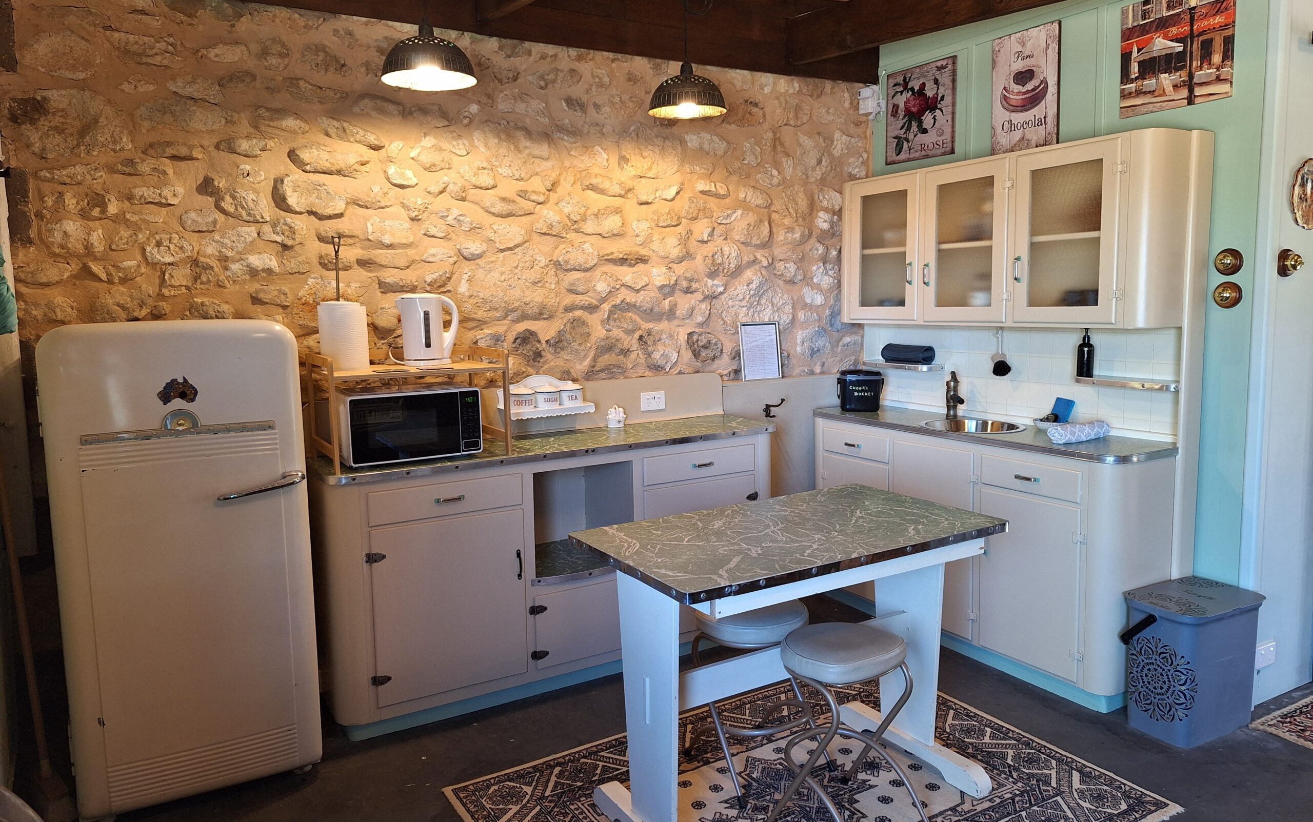 The kitchenette has a full size retro fridge, an induction hotplate, microwave, toaster, and kettle with utensils, a frying pan, and saucepan. There is also tea, instant coffee and a plunger with ground coffee as well as crockery and glassware. There is a retro table and two stools.