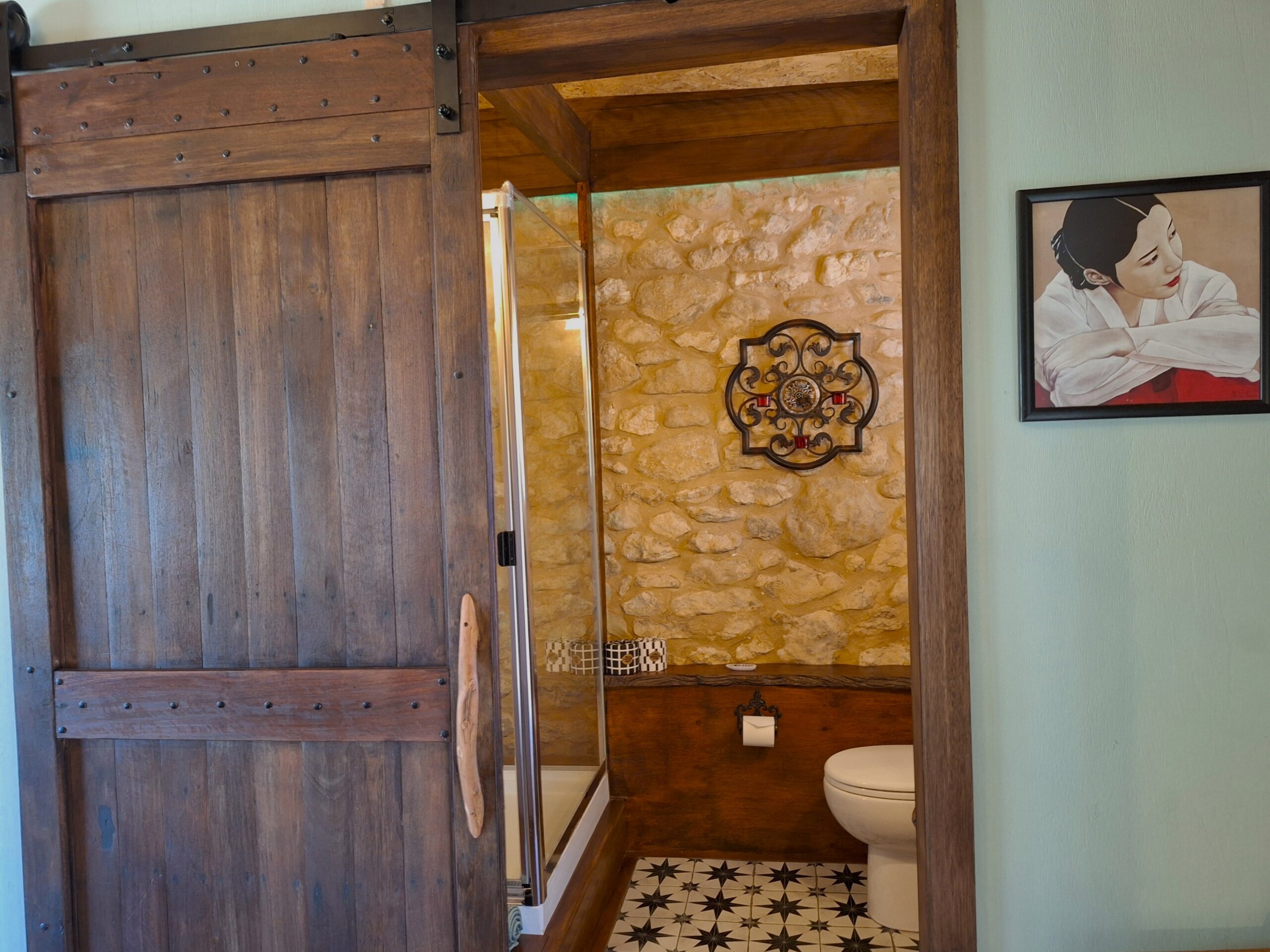 The building was built over the 1950s and 1960s as an open shed for farm equipment using local stone. The Studio was enclosed by the previous owners, John and Lis, and Lis used it as a painting studio. Rob has retained all the old stonework and the wooden beams, while insulating the ceiling and adding French doors to a private outdoor area. Stef’s touches include bespoke lead lighting, a homage to the Old Dairy in the form of Bessie and her calf, and an abundance of quirky objects, art and furnishings.
